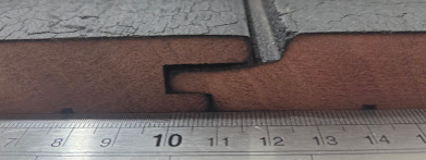 The above image is an example from a competitor in the timber industry of a timber board cupping. This is due to uneven charring and/or residual flame singeing the bottom of the board. Uneven charring leads to the cupping of a timber board, resulting in the timber boards being pushed outwards.